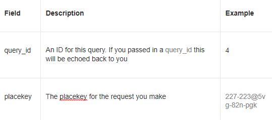 When accessing the /placekeys endpoint, your response will be a list of the above.