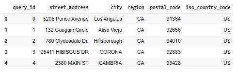 In the cell below you are telling the API, in a JSON format, which columns in your dataframe relate to the API query. Note: Country 'US' is hardcoded below. While it is not required, the more data you give Placekey, the easier the match process will be.