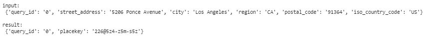 Note: Since we do not have POI names, just addresses, our Placekey on returns the Address Encoding from the WHAT portion of our Placekey