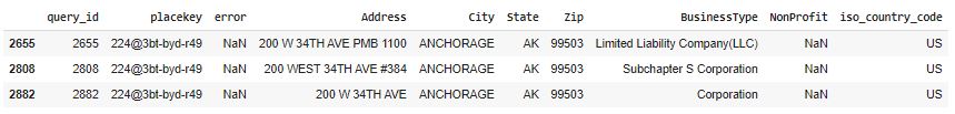 Below you will see how many of these address inputs were similar, yet different enough it cause a headache to try and do this without Placekey
