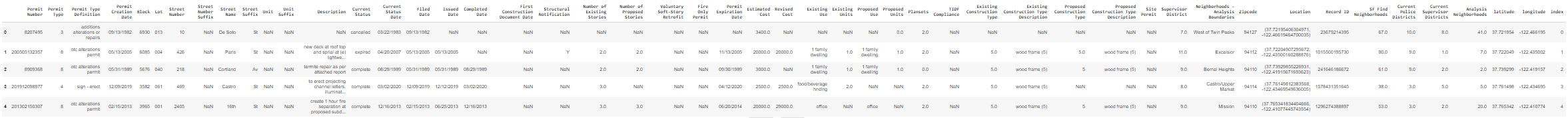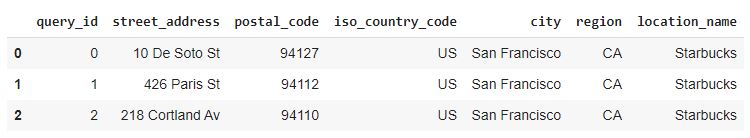 In this step, we create a new dataframe with just the address columns from the permits dataset. The columns are renamed and reformatted to conform to the Placekey API. Additionally, we add a location_name column to 'Starbucks' for every row, along with city = 'San Francisco' and region = 'CA'.