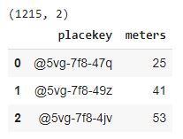Now, we are ready to join the datasets on Placekey. For simplicity, our use case will be to count nearby parking meters for each POI.