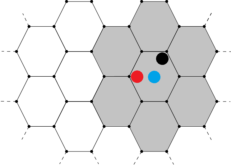 This approach is simple, but it has a problem. What if a POI is located near the edge of its hexagon? This approach might not count parking meters that could be right next to the POI if they happen to be in different hexagons. For example, the orange dot below shares a hexagon with the black dot, but it is clearly much closer to the blue dot.